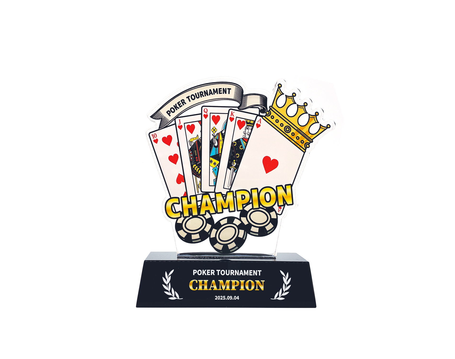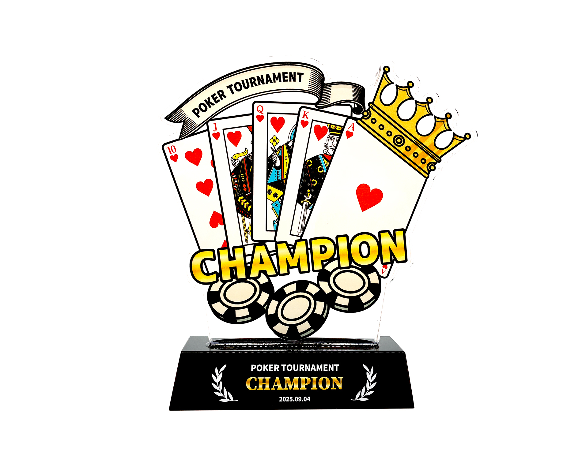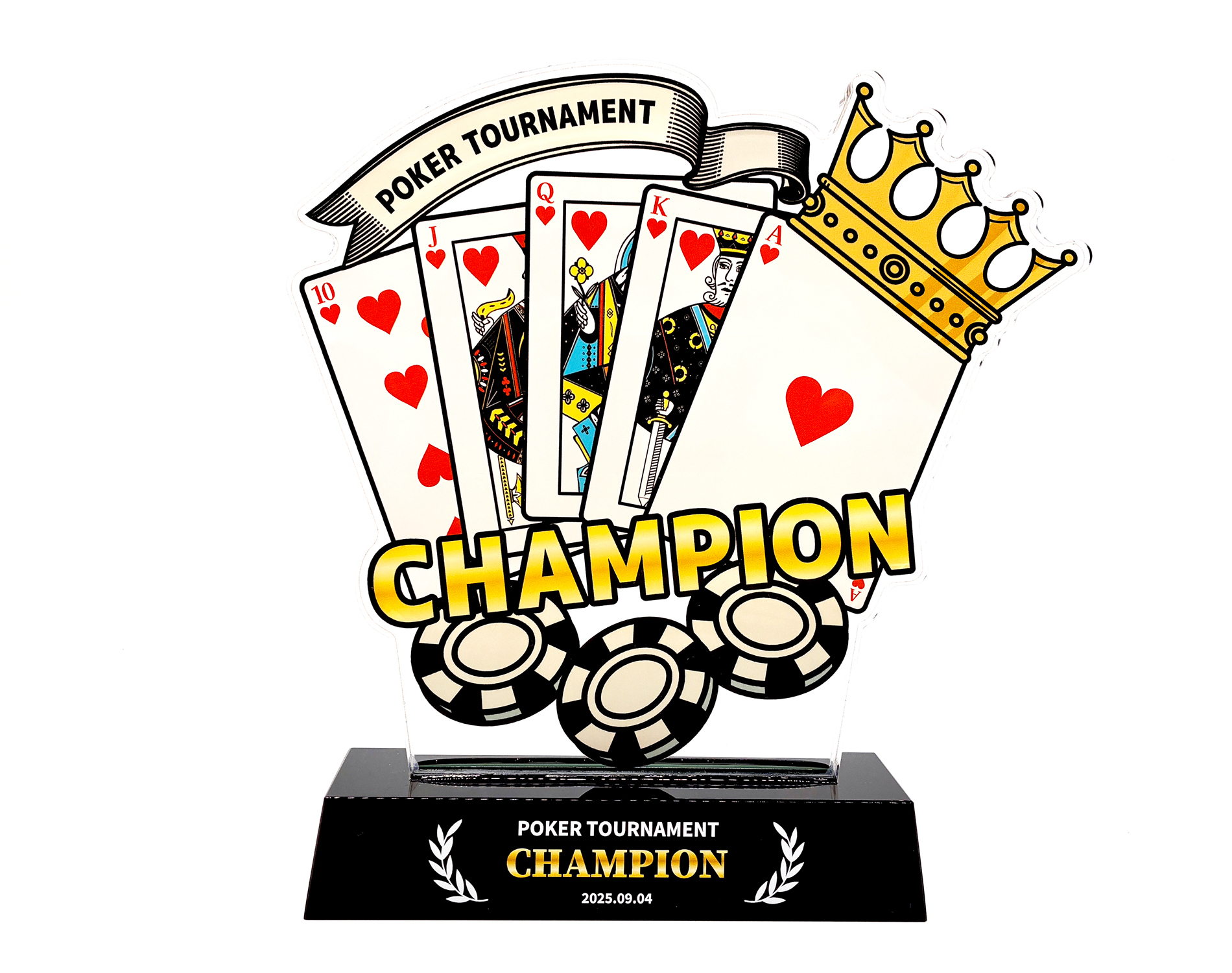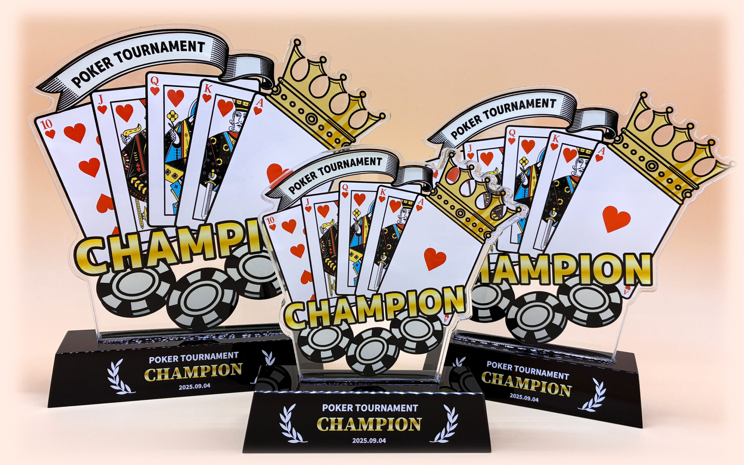ポーカー大会向けのオリジナルトロフィーを作成しませんか。合成樹脂(プラスチック)の一種である「アクリル」を使用することにより、クリスタルのような透明感・高級感のある見た目を持ちつつ、ガラスと比べてとても軽く、落としても割れにくいトロフィーの作成が可能です。思いを込めたたったひとつの自由なデザインを実現します。